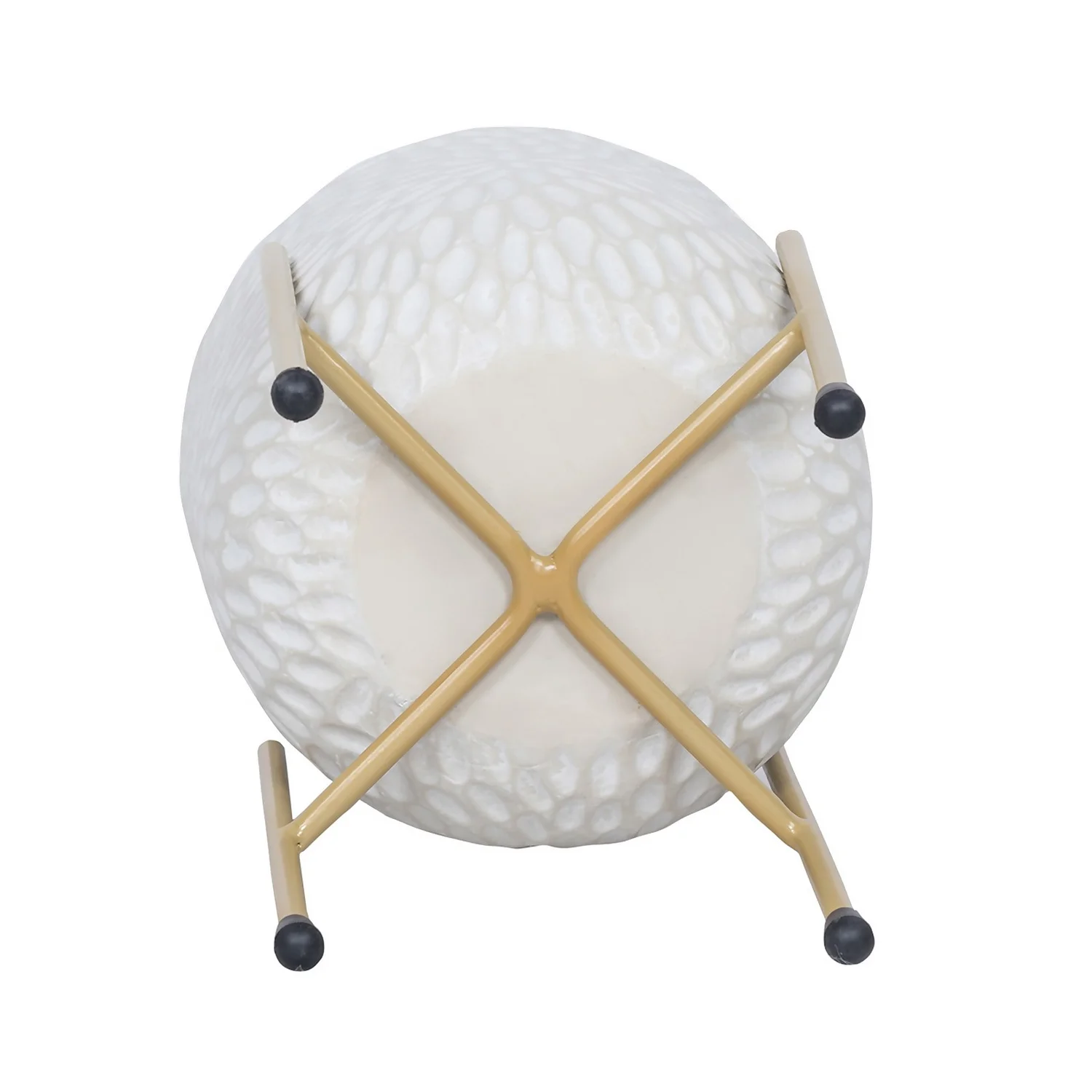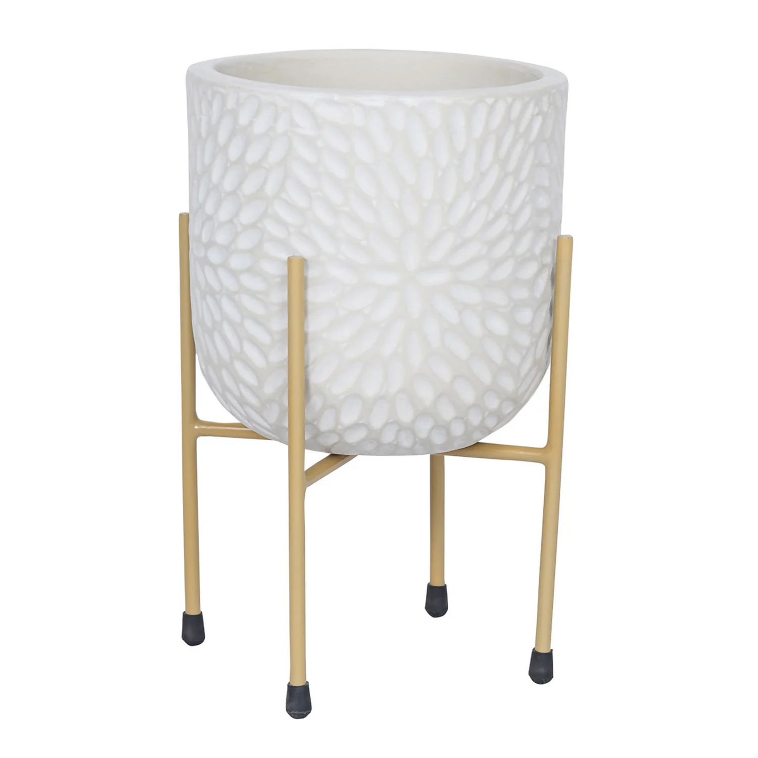 This beautiful medium white debossed ceramic planter supported by a gold metal stand is a perfect way for bringing warmth & greenery to your home.
