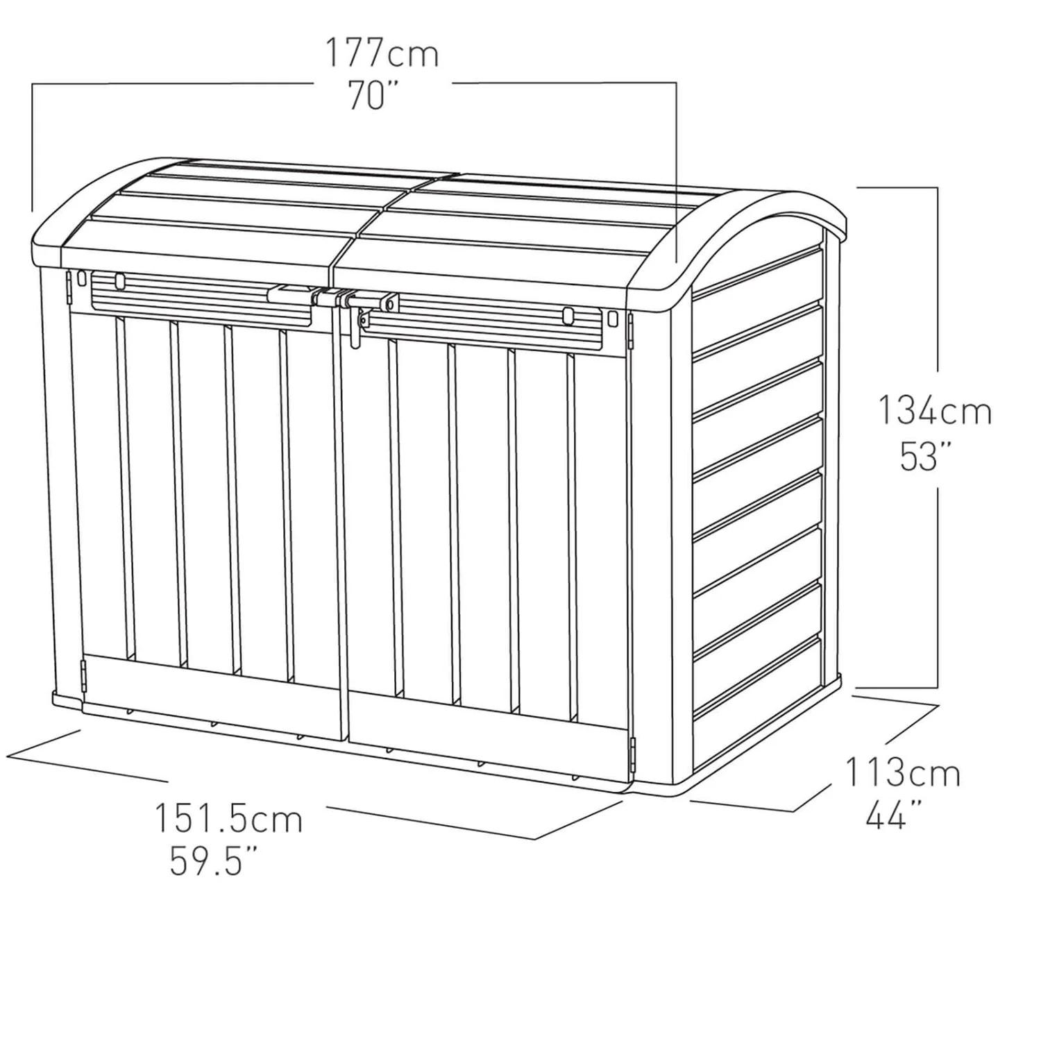 - Ideal outdoor storage solution for garden tools and equipment, BBQ and accessories, bicycles or x2 360L or three 120L wheelie bins