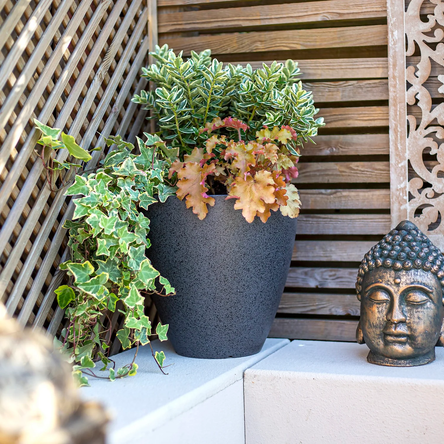 Made from recycled plastic, these Pinto pots are moulded and finished to look like terrazzo. When planted up its almost impossible to tell these lightweight pots from traditional materials.