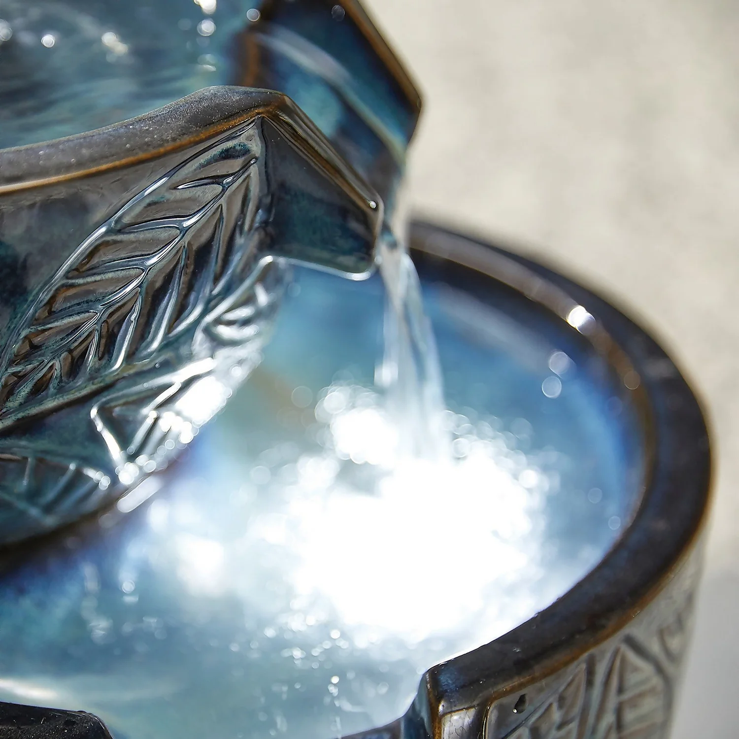 Suitable for even the smallest of gardens, the stunning Fossil Leaf water feature consists of three tiered bowls made to look like one is pouring water constantly into the other. A hand painted and detailed finish achieves the attractive look of porcelain whilst remaining robust thanks to its durable resin structure. As the sun goes down, the LED lights can be lit up for a beautiful night-time display.